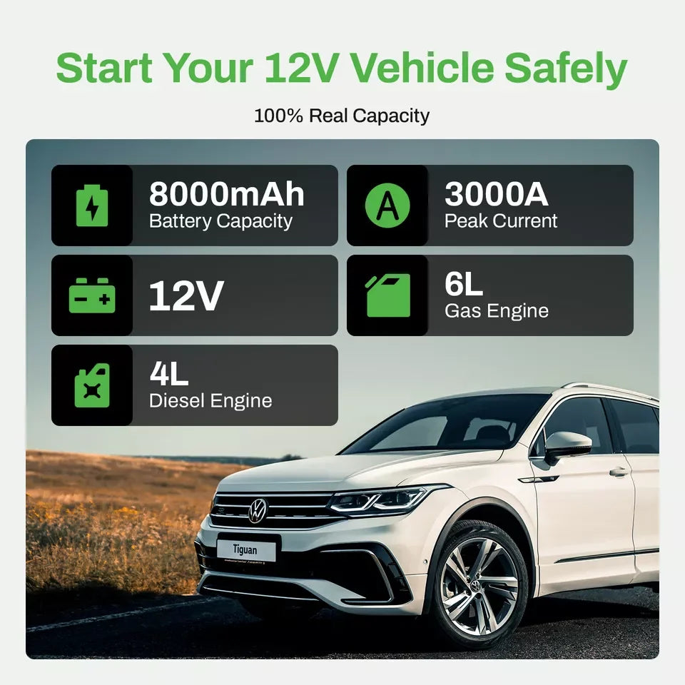 - Start almost any 12V engine quickly with a 3000A peak, capable of reviving up to 10L gasoline or 8L diesel vehicles.
