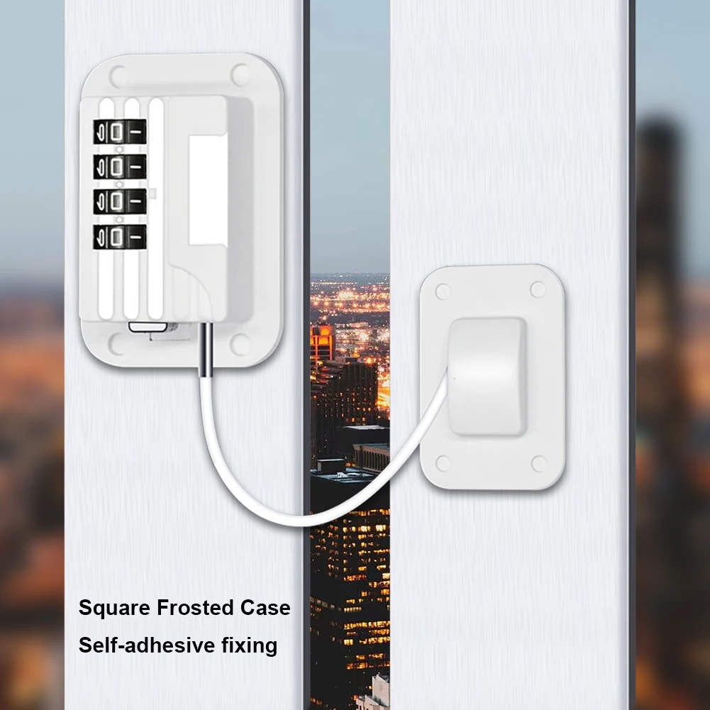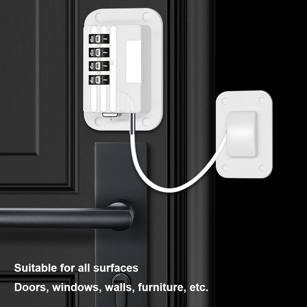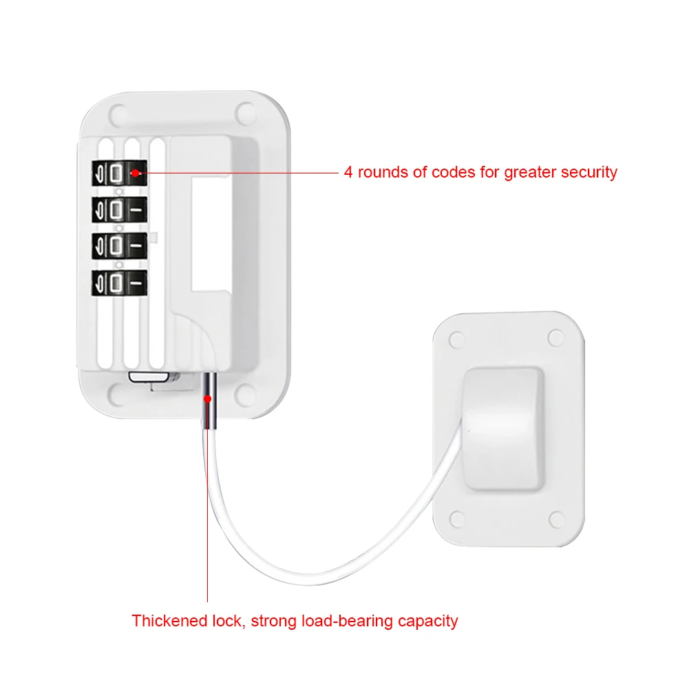 |  Child Safety Strap Locks No Drilling Refrigerator Combination Lock Versatile Kids Proof for Cupboards Wine Coolers Features: 1. Enhanced Security: Upgraded from a 3-wheel password system to a 4-wheel password system, this window and fridge lock provides stronger security, ensuring improved safety for children. Experience enhanced security with the improved 4-wheel password system, offering peace of mind and protection against potential accidents. 2. Sleek Square Frosted Case: Designed with a sleek square frosted case, this baby safety lock not only provides a compact and aesthetically pleasing appearance but also adds a touch of modernity. Its stylish design makes it easy to carry and use. Enjoy the combination of functionality and style with the compact and fashionable square frosted case, making it an attractive addition to your home decor. 3. Self-Adhesive Fixing: With self-adhesive backing, installation is a breeze. Simply peel off the adhesive and stick the lock in place without the need for drilling or damaging the walls. This convenient installation method saves time and effort. Experience hassle-free installation with the self-adhesive fixing feature, allowing you to secure the lock in place quickly and easily, without leaving any marks on your walls. 4. Widened and Thickened Lock Seat and Head: The lock seat and head have been widened and thickened to ensure a secure grip. Even with strong pulling force, the lock remains firmly in place, providing excellent load-bearing capacity. Experience the added durability and stability of the widened and thickened lock seat and head, preventing accidental detachments and ensuring long-lasting performance. 5. Suitable for Various Surfaces: This door window lock is compatible with various smooth surfaces such as walls, doors, and furniture. It can be effortlessly installed and used in different areas of your home, increasing its versatility and usability. Enjoy the flexibility and convenience of this lock, suitable for a wide range of surfaces, ensuring child safety throughout your living space.