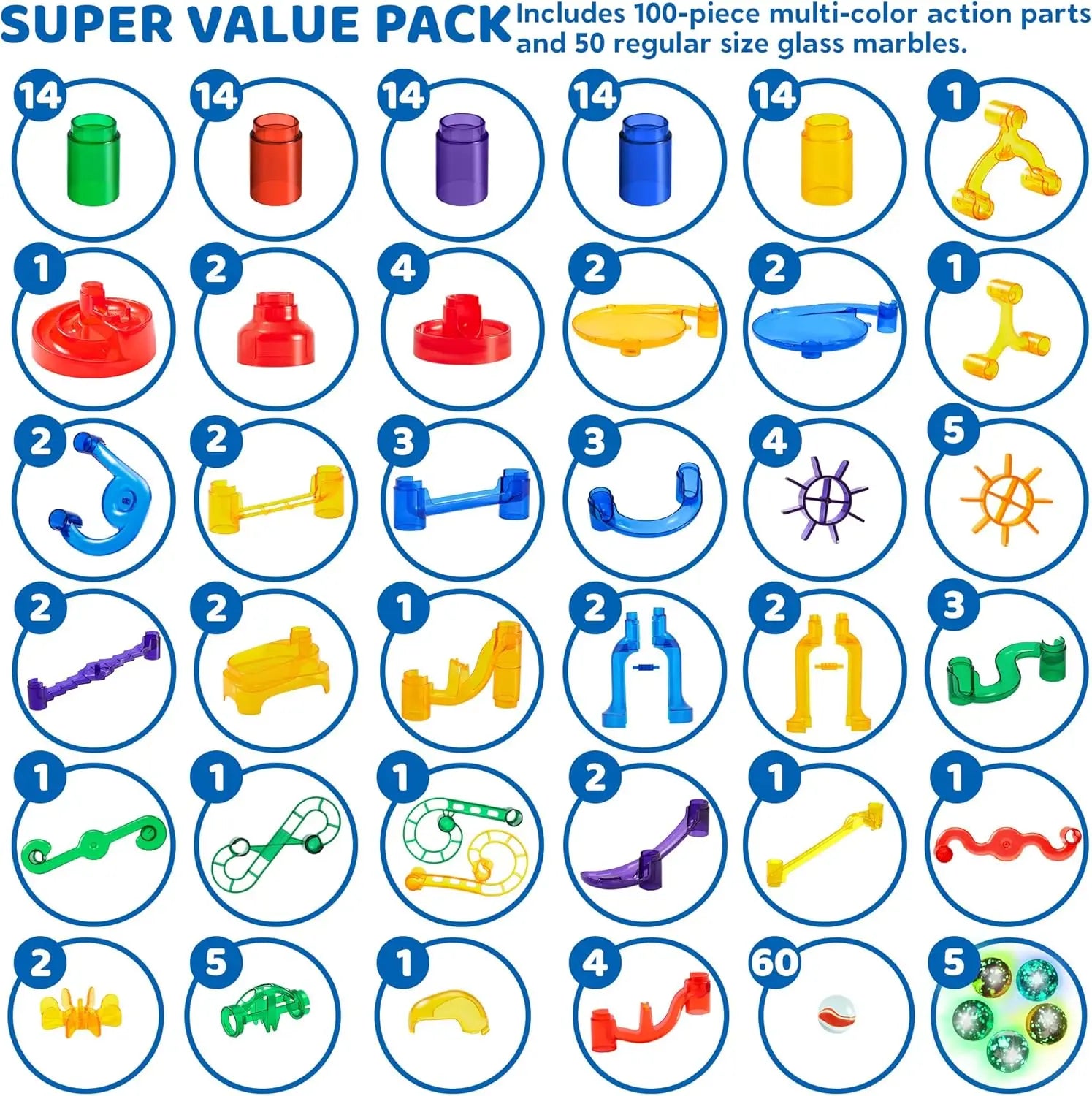 - You’ll receive 207 pieces, including 147 vibrant action parts and 60 regular-size glass marbles, delivering diverse, glowing tracks that captivate your child for hours.